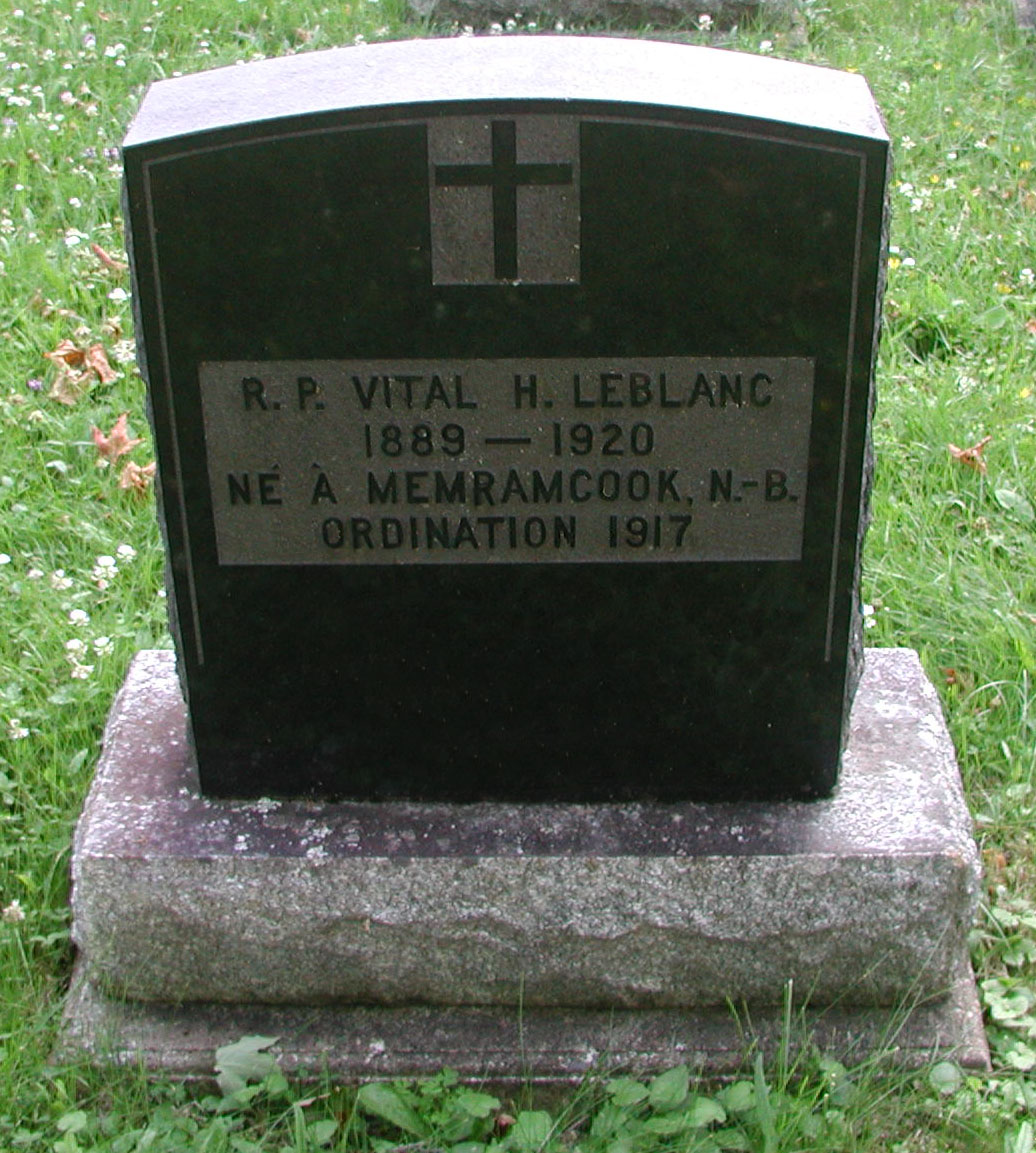 Après une maladie de deux mois le Rév. Père Vital LeBlanc trépassait à cinq heures, mardi, à l’hôpital de Moncton. Cette mort causera un profond regret à tous ceux qui ont connu le défunt. Tout en accomplissant son ministère, sa belle conduite lui a attiré l’affection de tous.