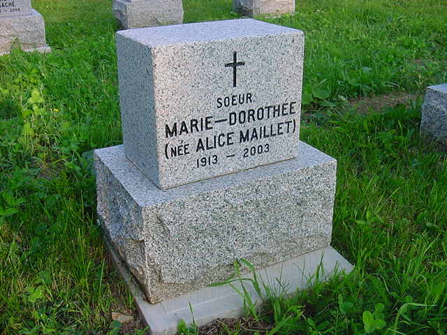 À la Maison-Mère des Religieuses Notre-Dame-du-Sacré-Coeur de Moncton, le mercredi 12 février 2003, à l'âge de 89 ans, est décédée Soeur Marie-Dorothée, n.d.s.c. (Alice Maillet) domiciliée à la Maison-Mère.