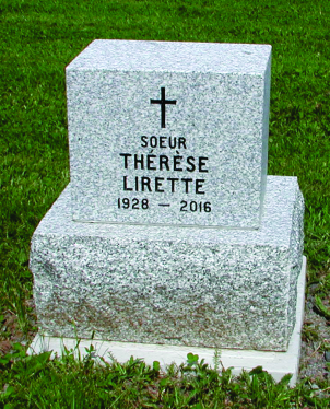 À la maison-mère des Religieuses Notre-Dame-du-Sacré-Cœur de Moncton, le vendredi 24 juin 2016, est décédée Sœur Thérèse Lirette (Sr Marie-Thérèse d’Avila), ndsc, à la suite d'une courte maladie. Elle avait 87 ans, dont 68 ans de vie religieuse. Née le 29 septembre 1928 à Moncton, elle était la fille de feu Louis et de feu Angéline (Arsenault) Lirette.