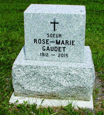 Suite à une longue maladie, à la Maison-mère des Religieuses Notre-Dame-du-Sacré-Cœur de Moncton, le mercredi 9 décembre 2015, est décédée Sœur Marie Gaudet (Sr Rose-Marie), ndsc. Elle avait 103 ans, dont 83 ans de vie religieuse. Née le 23 septembre 1912 à Memramcook, elle était la fille de feu Arthur et Albina (Gaudet) Gaudet.