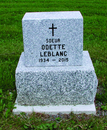 Suite à une longue maladie, à la Maison-mère des Religieuses Notre-Dame-du-Sacré-Cœur de Moncton, le lundi 12 octobre 2015, est décédée Sœur Odette LeBlanc (Odette-Thérèse). Elle avait 81 ans dont 63 de vie religieuse. Née le 30 septembre 1934 à Moncton, elle était la fille de feu Lucien et Emma (Gallant) LeBlanc.