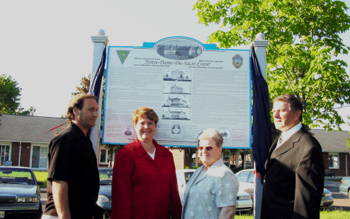 De gauche à droite : Pierre Landry, directeur du Foyer Saint-Thomas où se situe le panneau; Denise Léger-Collin, présidente de la Société; soeur Murielle Duguay, Supérieure-générale des religieuses Notre-Dame du Sacré-Coeur; Gérard LeBlanc, président, comité de l'Écomusée.