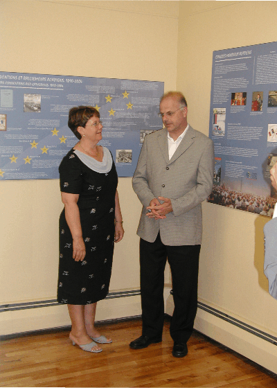 Notre présidente Denise s'entretient avec M. Maurice Basque du Centre d'Études Acadiennes, responsable du développement des divers panneaux faisant partie de l'exposition.