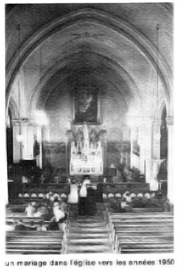 Le Père René Lauzon devint curé en 1966, l'année de la fermeture du collège à Saint-Joseph et de son transfert définitif à l'Université de Moncton. Le Concile Vatican II venait de se terminer l'année précédente et c'était la période de transition dans l'Eglise. Le Père Lauzon avec une équipe de deux vicaires devait voir à l'implantation progressive des décisions de Vatican II chez nous. Réformes en liturgie; simplifications dans l'aménagement de l'église, plus grande participation de l'assemblée dans le chant, formation du Groupe Rythmé avec le Père Emery Brien. Introduction de la cathéchèse aux adultes avec le P. Sylvio Doiron en 1967, organisation d'un programme renouvellé de catéchèse dans toutes les écoles primaires et secondaire de la Vallée, surtout avec le P. Brien. Les transformations dépassaient cependant ces secteurs: on introduisit une participation élargie des paroissiens dans la gestion des affaires paroissiales et la pastorale en général avec l'établissement d'un conseil paroissial élu et des comités. Un groupe de prière du renouveau charismatique se réunit tous les mercredis soirs depuis 1971: ils sont plus de cent. Les paroissiens sont fiers de leur belle vieille église qui rappelle le lien avec leurs ancêtres dans la foi et leur désir de se rassembler dans un édifice avec un caractère de sacré. Durant les 15 dernières années, bien des efforts ont été faits pour conserver et améliorer l'église, le presbytère et l'environnement. Tout récemment en 1976, on a installé des verrières dont les motifs rappellent l'histoire religieuse de la paroisse, les fondations de communautés chez nous et les grandes dévotions des ancêtres. En même temps, les artistes des Arts Religieux de Québec ont peint la fresque du Christ glorieux dans le sanctuaire. |