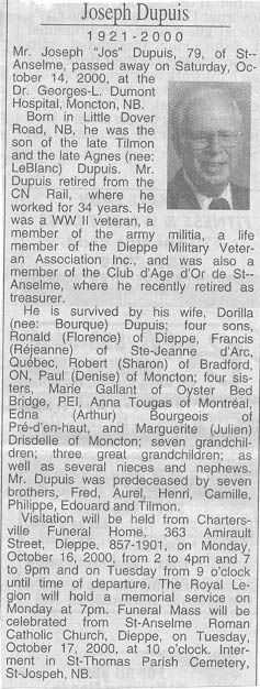 Né au Petit Dover, le 25 mars 1921, « Jos » était le fils de Tilmon à Philippe et d’Agnès à Alphée LeBlanc mariés à Memramcook le 21 septembre 1909.